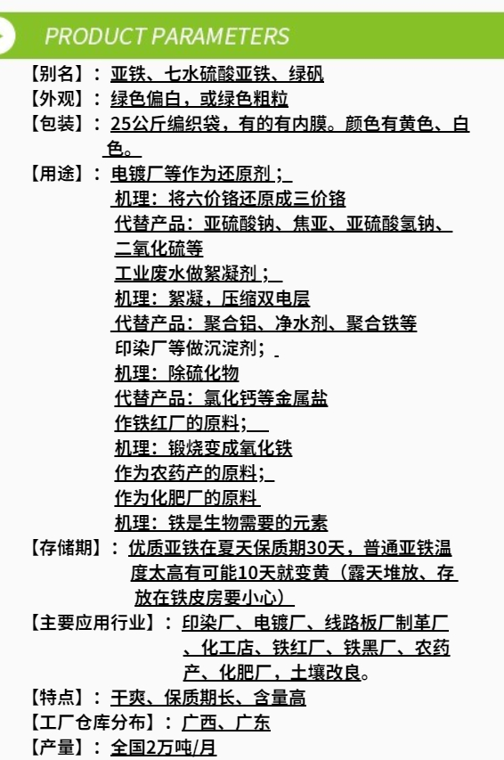 廣泛用于印染,造紙,生活污水,工業廢水的絮凝澄清與脫色,硫酸亞鐵還可用以處理含鉻廢水和含鎘廢水.等高堿度,高色度廢水處理,可以減少中和用酸的大量投入。